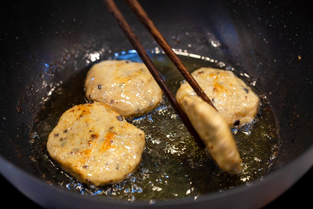 – Làm nóng dầu ăn trong chảo, lăn tròn các miếng chả trên chảo để lá lốt hơi se lại, bám vào thịt. Rán trên lửa vừa tới khi chả xém đều. Gắp ra đĩa.