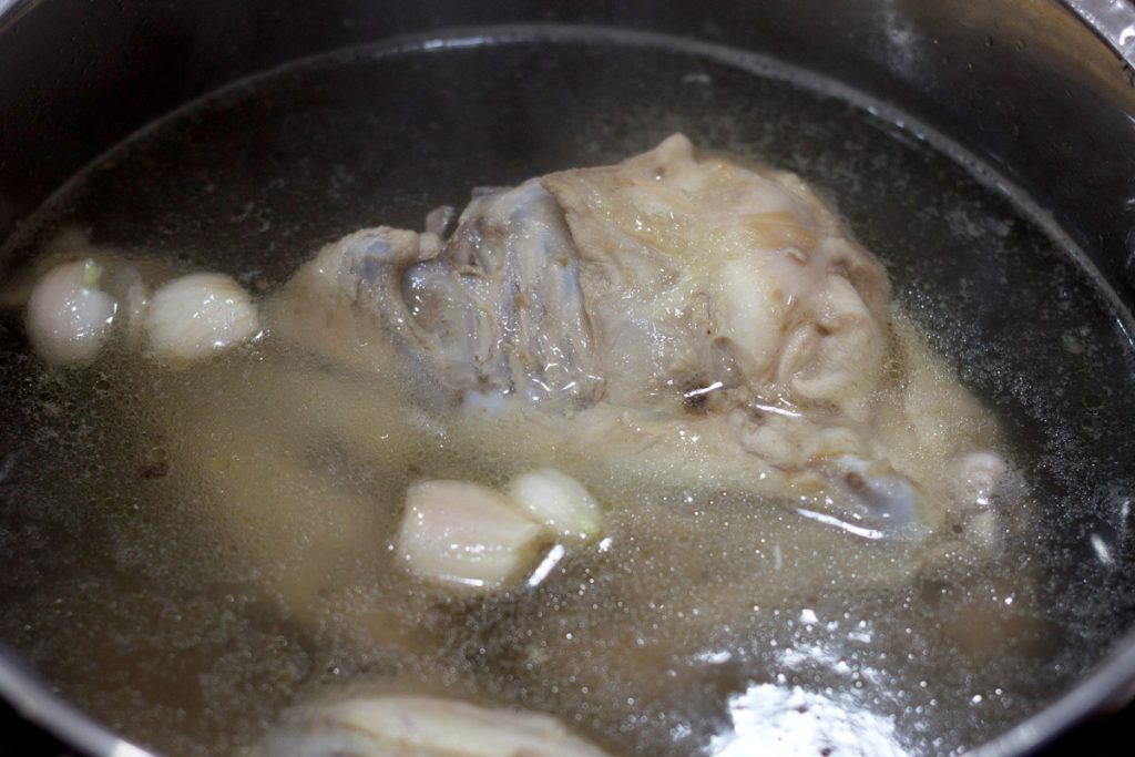 1. Sườn rửa sạch, cho vào nồi nước đun sôi khoảng 2 – 3 phút để cho ra các bọt bẩn. Đổ sườn ra rửa sạch. Cho sườn vào nồi và đổ nước ngập gấp 3 lần sườn, ninh lửa nhỏ trong 30 – 40 phút. Có thể thả thêm vài củ hành khô (nướng xém vàng, bóc vỏ) cho thơm.