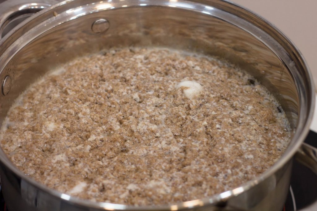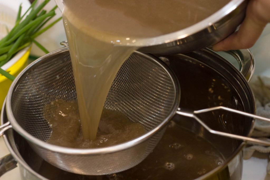 – Hòa cua xay với nửa bát to nước. Dùng tay khuấy và bóp nhẹ cho thịt cua hòa đều trong nước. Đặt rây lên nồi,nhẹ nhàng đổ bát cua qua rây, phần vỏ cứng sẽ được giữ lại. Dùng tay bóp phần vỏ này cho kiệt nước rồi đổ trở lại bát. Lặp lại thao tác bóp và lọc cua với nước như trên 1 – 2 lần nữa để lấy được sạch thịt cua. Ta được phần nước lọc cua trong nồi riêng.