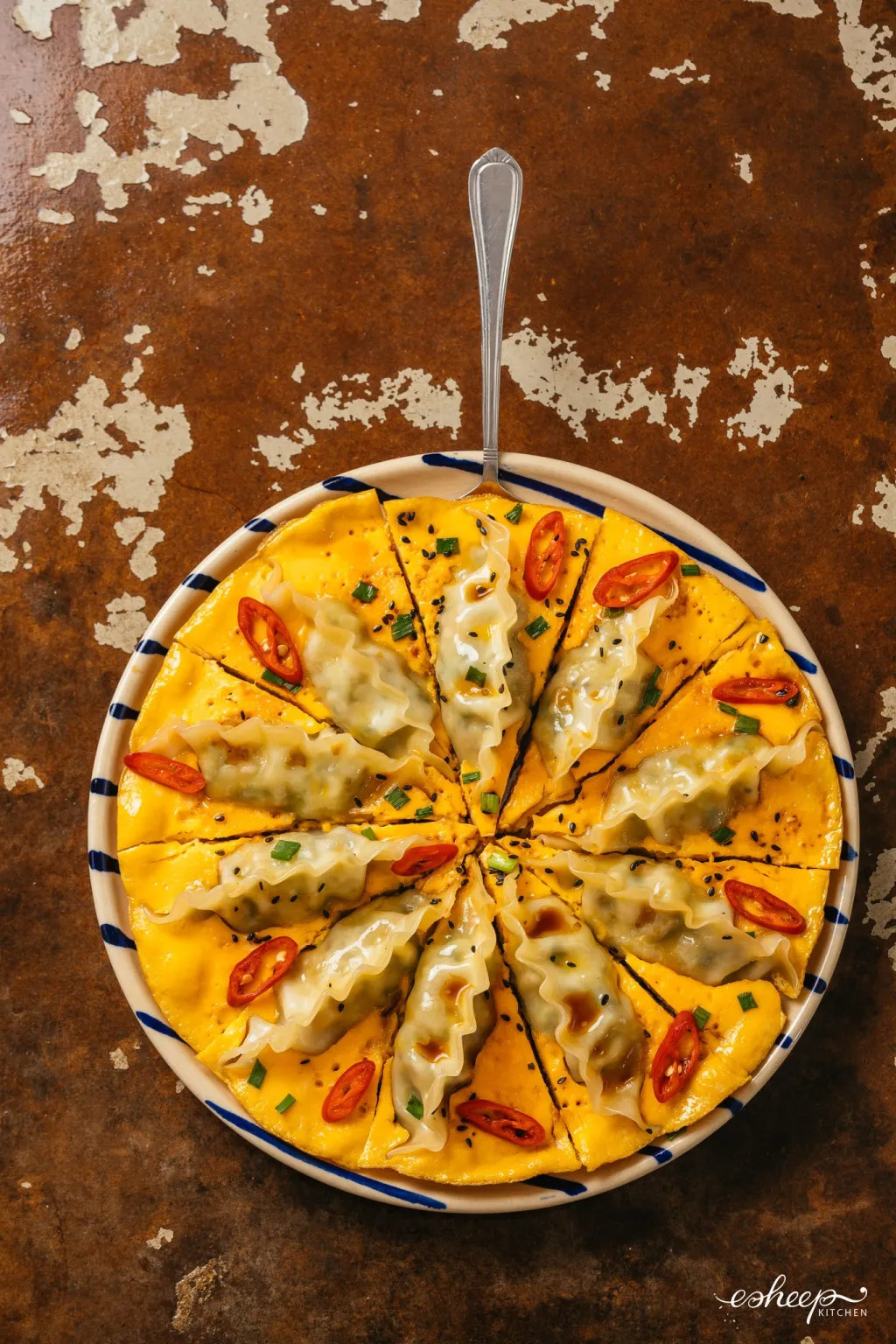 Nay ăn sáng bằng “pizza” luôn, nhưng pizza này nó lạ lắm!!Thật ra là bánh xếp chiên trứng nha
