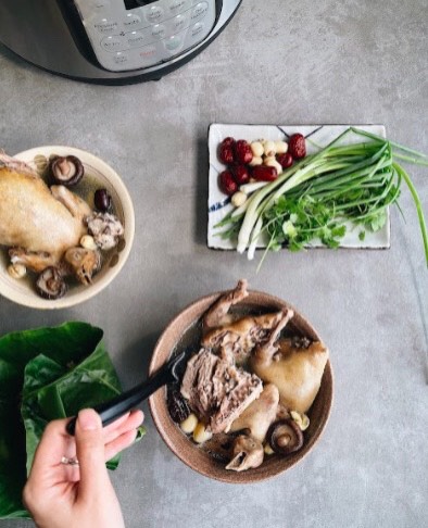 - Bước 8: Đặt lại chim đã nhồi vào nồi. Thả thêm táo đỏ, hạt sen, nấm hương, muối và nước vào.