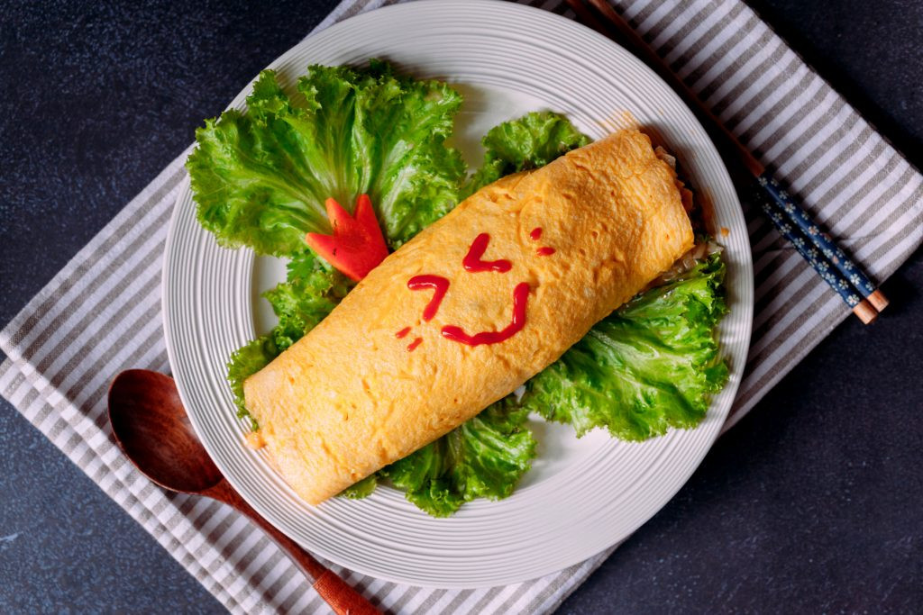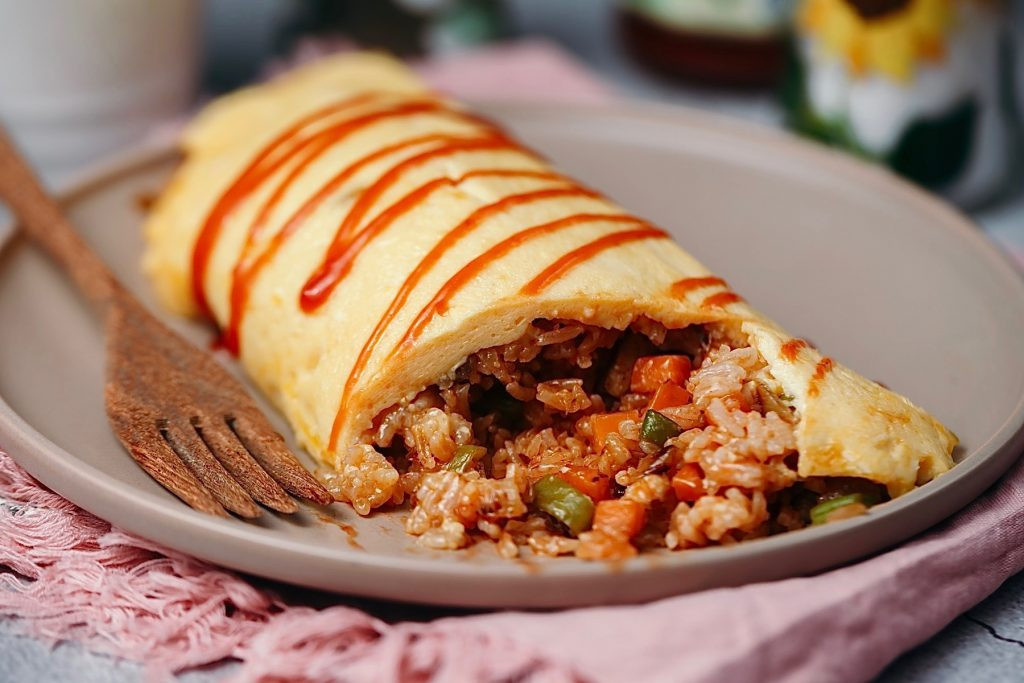 – Đổ trứng vào chảo, để lửa vừa, để trứng dàn mỏng hết mặt chảo. Đợi mặt dưới của trứng chín se lại và vàng ươm thì xúc cơm rang để lên 1/2 mặt trứng. Dùng phới dẹt/ xẻng cẩn thận lật phần trứng bên kia gập vào phần có cơm rang, sao cho trứng bọc kín được cơm, sau đó nhẹ nhàng trút cả bọc trứng cuộn cơm ra đĩa.