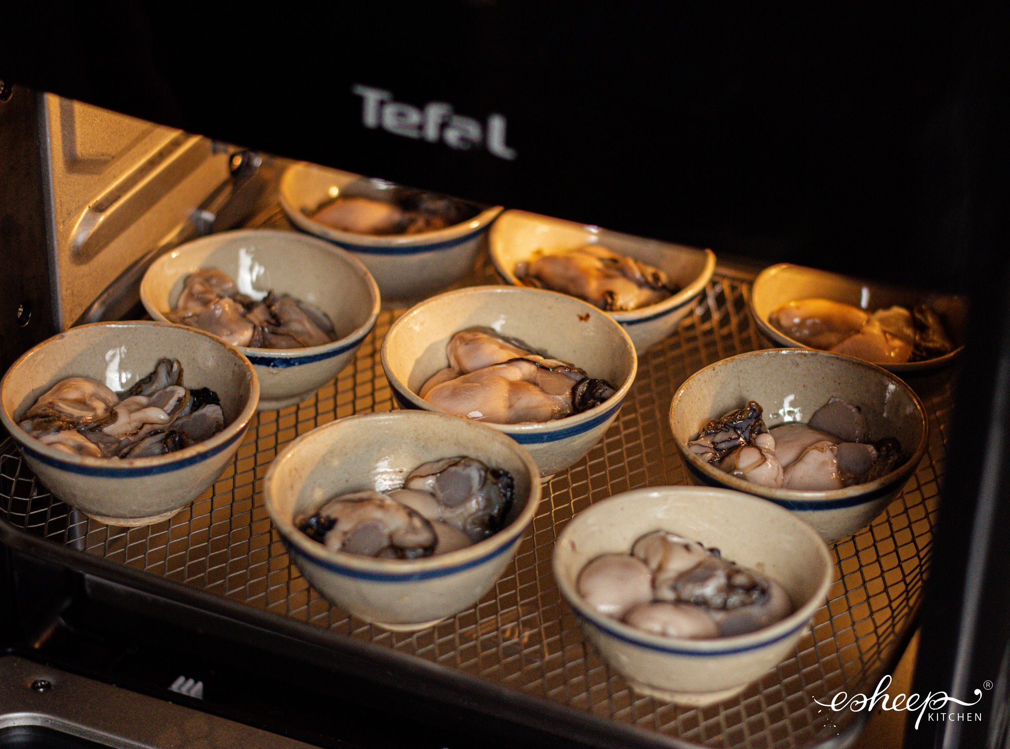 Hàu ráo sạch, xếp ruột hàu vào từng chén nhỏ hoặc khuôn, nướng sơ bằng NCKD ở 190℃ trong 4 phút cho chín sơ