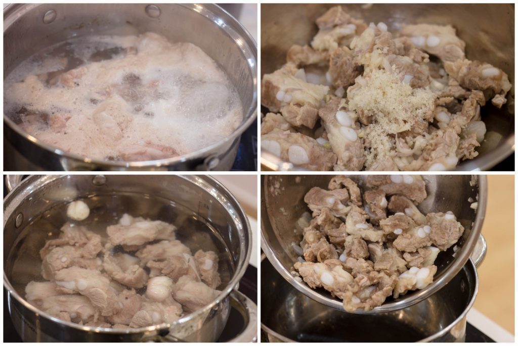 – Đun sôi nước rồi cho sườn vào chần với 1 thìa cafe muối, ta sẽ thấy nhiều bọt bẩn nổi lên. Đổ bỏ nước, rửa lại sườn thật sạch. Ướp sườn với 1 chút hành khô băm nhỏ, 1 thìa cafe gia vị, để 15’ cho ngấm.