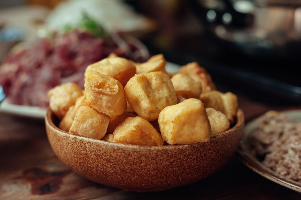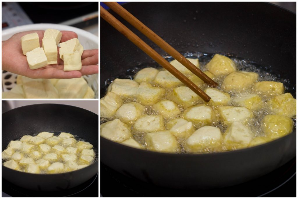 3. Đậu phụ rửa sạch, thấm khô nước, cắt thành miếng vuông cỡ 1,5cm. Rán ngập dầu cho đậu vàng giòn các mặt.