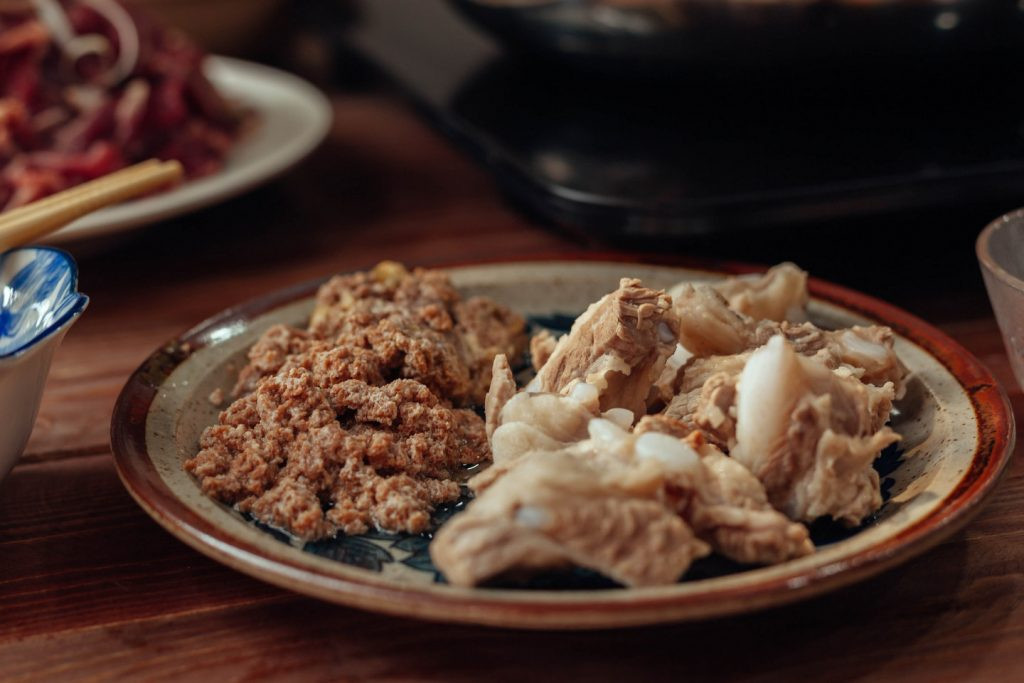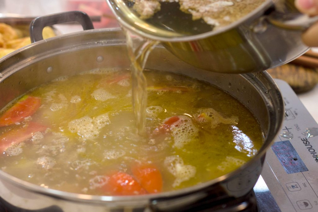 7. Bắc nồi lẩu lên bếp, múc nước dùng cua đầy ½ nồi, sau đó cho nước ninh sườn cùng sườn sụn vào đến gần đầy nồi. Nêm vào nồi lẩu mẻ đã lọc, dấm bỗng và chút gia vị sao cho vừa khẩu vị.