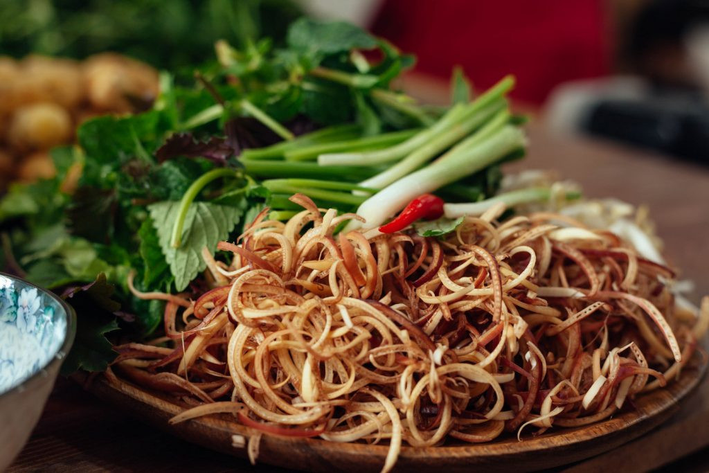 - Rửa sạch các loại rau sống, ngâm trong nước muối loãng 5’, vẩy khô nước.