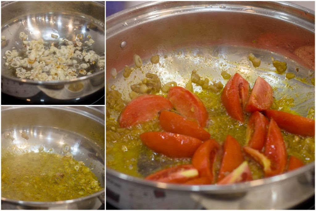 6. Đun nóng 1 chút dầu ăn trong chảo, cho hành khô thái lát vào phi đến hơi hanh vàng, cho gạch/ trứng cua vào xào chín, sau đó cho cà chua bổ múi cau vào xào sơ, tắt bếp.