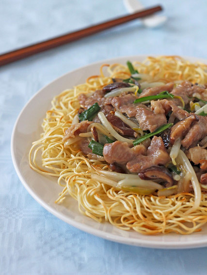 Mỳ xào giòn có lẽ cũng không phải là món ăn xa lạ với người Việt mình. Có nhiều kiểu mỳ xào giòn, nhưng theo mình hiểu thì một món mỳ xào giòn nói chung thường gồm có 2 phần: mỳ đã được làm giòn với một món xào có thịt & rau. Mỳ thì là cái cố đỉnh rồi, còn phần thịt & rau thì có thể thay đổi tùy theo sở thích, chẳng hạn như thịt bò xào cải chíp, thịt bò xào cần tỏi, bò xào nấm, tim cật xào thập cẩm… Công thức mà mình giới thiệu ở dưới là cải biên của Pork Chow Mein của TQ nên gồm thịt lợn, nấm, giá và hẹ, nhưng có thay đổi một chút cho phù hợp với khẩu vị của người Việt (rất ngon, nếu không xào mỳ thì mình nghĩ xào thịt với nấm và giá kiểu này cũng có thể làm một món mặn ăn cơm được.