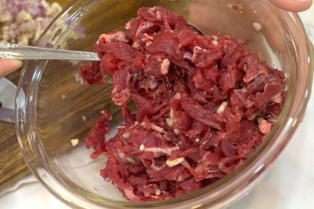 1. Thịt bò để ngăn đá tủ lạnh cho hơi cứng lại, thái thật mỏng. Hành, tỏi bóc vỏ, băm nhỏ. Ướp thịt bò với dầu hào, 1 thìa cafe gia vị, hạt tiêu, ½ chỗ hành tỏi băm. Để 30’ cho ngấm.