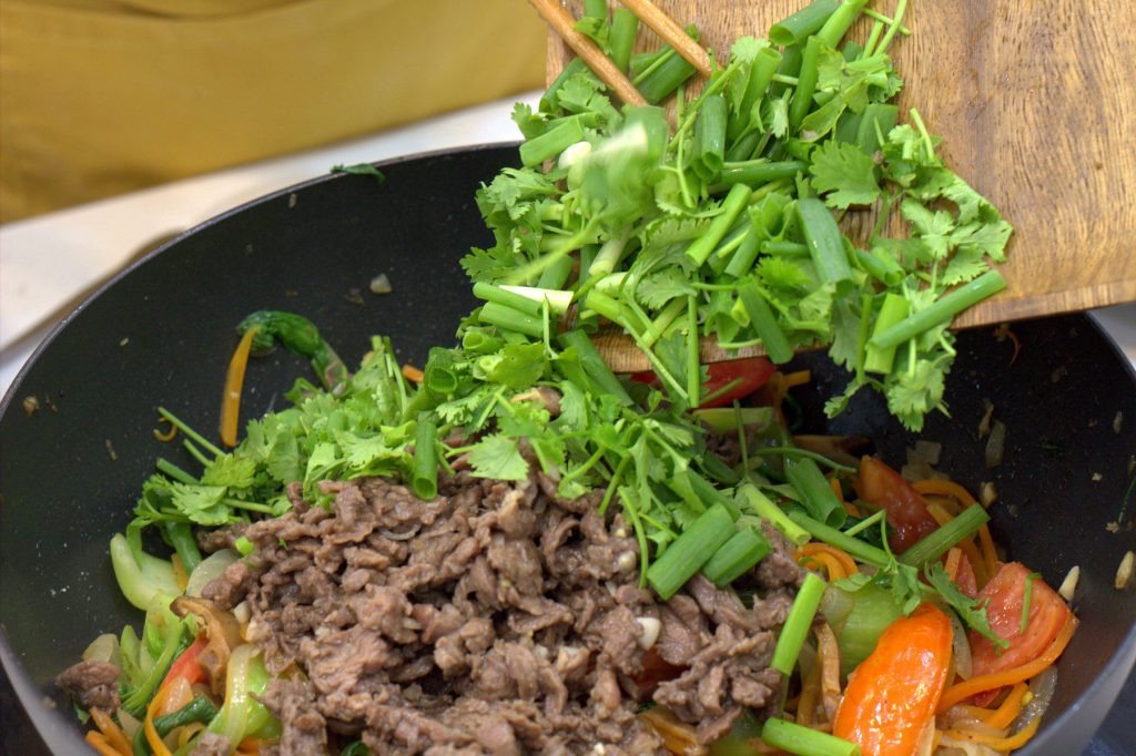 8. Hòa bột năng với khoảng nửa bát con nước lạnh. Trút lại bát thịt bò xào sơ vào lại chảo, đảo đều. Cho bột năng vào chảo, nhanh tay đảo cho bột hòa quyện với hỗn hợp rau thịt. Cho hành lá, rau thơm thái khúc vào chảo, đảo đều và tắt bếp.