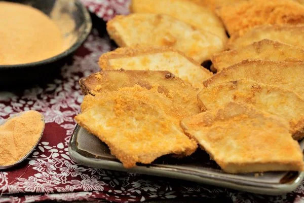 Cuối cùng, bạn bày sake vừa chiên vàng lên đĩa và thưởng thức cùng tương ớt. Tiếng miếng sake chiên bột có vị ngọt tự nhiên, béo ngậy, bùi bùi đem lại trải nghiệm hấp dẫn cho người ăn. Trong trường hợp sử dụng không hết, bạn có thể cho sake đã chiên vào bảo quản trong ngăn mát tủ lạnh.